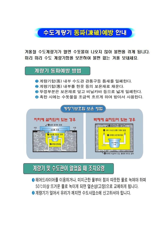 또 상수도 동파 피해 최소화를 위해 동파 방지 계량기 보급확대, 수도관 동결 파손 시 긴급복구 및 비상급수 장비 확보 등 동파 방지대책을 구체적으로 마련하고, 요금고지서.신문.반상회 등에 계량기 보온조치 방법 등 동파 방지 홍보활동도 강화할 계획이다.