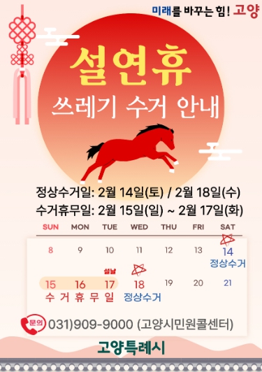 다만 2월 15일부터 17일까지는 수거업체 휴무로 생활쓰레기 수거가 진행되지 않는다.