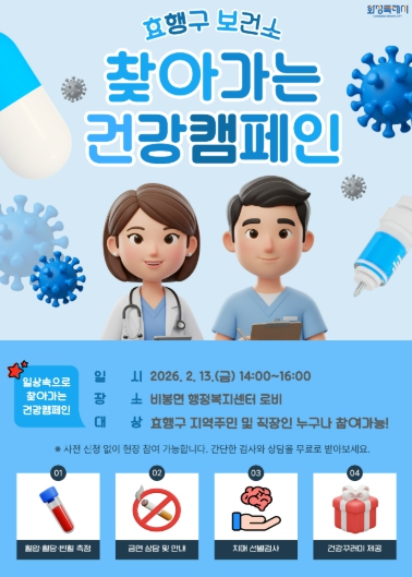 이번 캠페인은 효행구청 체제 출범에 따라 개편된 효행구보건소의 역할과 기능을 주민들에게 알리고, 주민들이 생활권 내에서 손쉽게 건강 상태를 점검하며 보건소의 다양한 건강 증진 서비스를 안내받을 수 있게 하도록 추진된다.