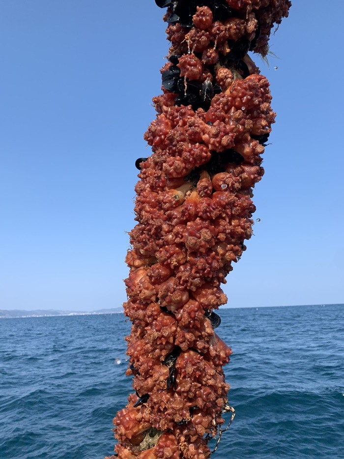 | ▲ 경북 영덕군 멍게양식협회에서 추진한 멍게 본양성에 성공한 멍게들이 가득 달려있다.(사진=경북도 제공) |