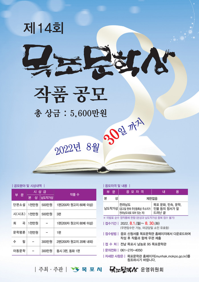 작품 공모에 대한 자세한 사항은 목포문학관 홈페이지에서 확인할 수 있다.
