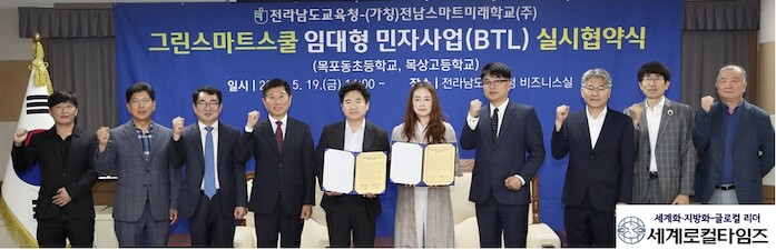 [세계로컬타임즈 김명진 기자] 전남교육청이 (가칭)전남스마트미래학교(주)와 목포동초등학교·목상고등학교에 대한 ‘그린스마트 미래학교 임대형 민자사업(BTL)’ 실시협약을 체결했다.
