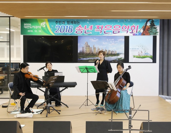 [세계로컬타임즈 오영균 기자] 대전도시공사는 19일 오후 대전시 중구 대흥동 본사 1층 로비에서 지역주민과 함께하는 작은 음악회를 개최했다. 실내악과 성악 등으로 약 1시간 동안 진행된 이번 행사는 연말을 맞아 도시공사 인근의 상가 및 기관 종사자 등 주변이웃들과 정을 나누고 지난 한해의 협조에 감사하기 위해 마련됐다.