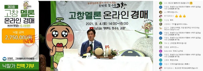 4일 오후 고창군 동리국악당에서 고창군이 주최하고, 고창멜론생산자연합회가 주관한 ‘고창멜론 온라인 경매’가 열렸다. 지난해에 이은 3번째 행사다. 경매는 고창군 공식 유튜브 라이브방송을 통해 전국민 누구나 쉽게 댓글로 참여하고, 시청할 수 있도록 했다.