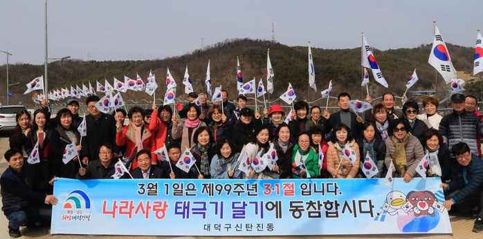 [세계로컬신문 오영균 기자] 대전 대덕구 신탄진동이 27일 제99주년 3.1절을 맞아 선열들의 나라사랑 정신을 기리고, 태극기의 소중함을 일깨우기 위해 동 자생단체 회원 100여명이 모여 대청대교를 태극기대교로 만들었다고 밝혔다.