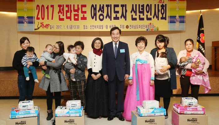 | ▲ 이낙연 전남지사와 부인 김숙희 여사, 김양희 전남여성단체협의회장이 6일 오후 목포 신안비치호텔에서 열린 '2017 전라남도 여성지도자 신년인사회'에서 다자녀 가정에 유아용품을 전달한 뒤 기념촬영을 하고 있다.<사진제공=전남도청> |