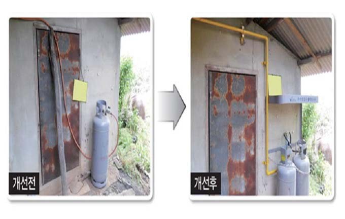 ▲ 고무호스가 연결된 개선전 (좌측) 가스 설비가 금속배관(우측)으로 개선돼 가스 누출 사고 위험이 사라진 모습. (사진=뉴스핌 갈무리) |