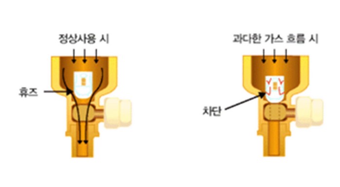 | ▲ 규정량 이상의 가스가 흐르면 가스를 차단하는 안전장치가 작동되어 가스누출로 인한 사고를 방지할 수 있는 장치로 배관과 호스 또는 배관과 퀵카플러의 연결부분에 장치한다. |