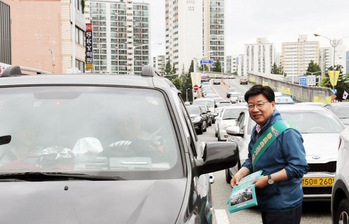 | ▲권선택 대전시장이 17일 삼성동 성당 4거리에서 차량운전자에게 지하차도 공사로 홍도과선교 폐쇄에 따른 우회도로 이용방법을 홍보하고 있다.<사진제공=대전시청> |