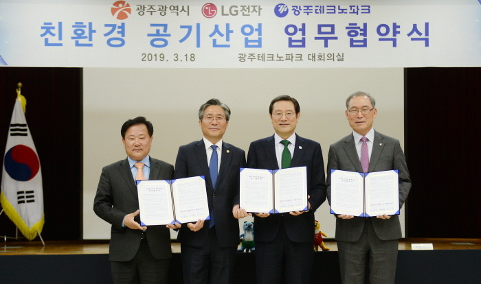 이번 MOU 체결식은 광주시-LG전자-광주테크노파크가 공기산업 육성을 위해 상호 협력하기 위해 마련됐으며 성 장관과 이용섭 광주시장, 송대현 LG전자 사장(H&A 사업본부장) 등 이 참석했다.