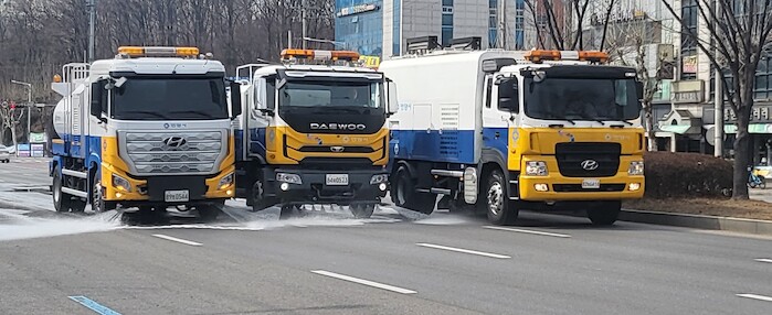▲안양시가 살수차를 동원해 도로변 미세먼지 제거작업을 하고 있다.(사진=안양시) |