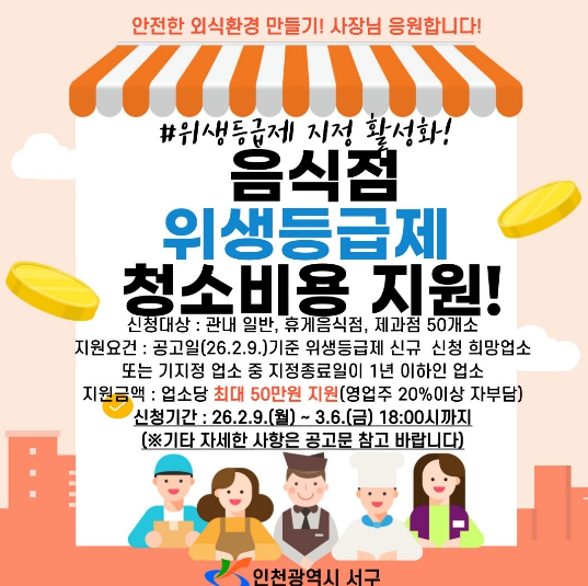 강범석 서구청장은 “이번 지원 사업이 소상공인들에게 실질적인 도움이 되고, 서구의 외식 환경을 한 단계 높이는 계기가 되길 바란다”라며 “안전한 먹거리 문화 정착을 위해 영업주분들의 적극적인 참여를 부탁드린다”라고 전했다.