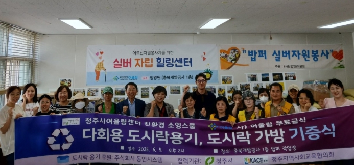 기증된 도시락 가방은 청주시여울림센터 ‘친환경 소잉스쿨’ 프로그램에서 폐현수막을 활용해 제작했으며, 다회용 도시락 용기는 (주)동인시스템에서 마련했다.
