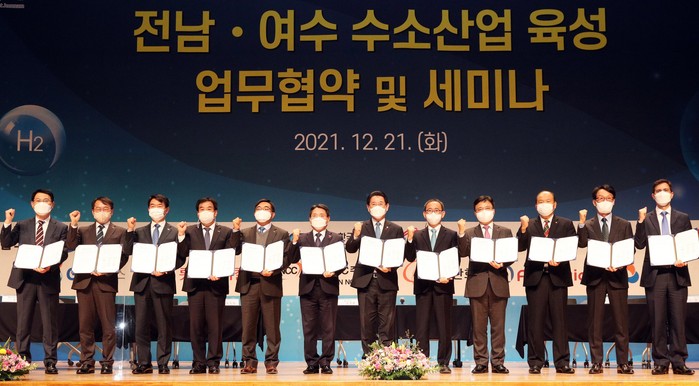 전남도는 21일 여수시청에서 김영록 전남도지사, 권오봉 여수시장을 비롯해 GS칼텍스, 롯데케미칼, 한화/글로벌, 여천NCC, 에어리퀴드코리아, 한양 등 여수산단 주요 기업과 발전공기업 등 13개 기관이 참석한 가운데 ‘수소산업 육성 업무협약’을 했다.