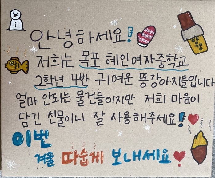 목포이랜드노인복지관 강주호 관장은 “매년 목포혜인여자중학교 학생과 교직원의 어르신을 향한 따뜻한 마음에 진심으로 감사하다.