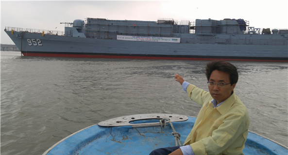 | ▲ 김광수 서울시의원이 지난 3일 행주대교 남단에 계류 중인 퇴역군함 '서울함'에 배를 타고 접근해 계류 이유에 대해 지적하고 있다. <사진제공=서울시의회> |