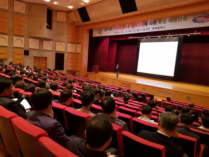 | ▲ 17일 대전시는 시청 대강당에서 본청 6급 이하 공무원 및 공무직을 대상으로 직장 성희롱 등 4대 폭력예방교육을 실시하고 있다. (사진= 대전시 제공) |