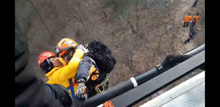 | ▲ 대전소방항공대가 4일 충북 영동군 황간면 월류봉 인근에서 낙상한 여성을 구조대원이 호이스트를 이용해 구조하고 있다. |