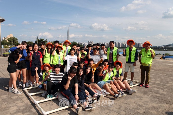 | ▲ 한국환경체육청소년연이 개최한 '제1회 페트병 뗏목 한강건너기' 행사에 많은 학생들이 참여한 북악중학교팀이 뗏목을 만든 후 단체로 기념촬영하고 있다. |