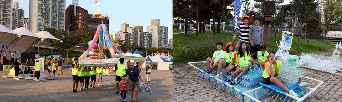이번 행사에 사용된 뗏목은 각 학교에서 수거해 온 페트병과 대회 조직위에서 제공한 페트병을 사용했으며 뗏목의 기둥역할을 하는 기본 틀(pvc)과 묶는 선, 테이프를 제외한 모든 자재는 쓰레기를 재활용했다.