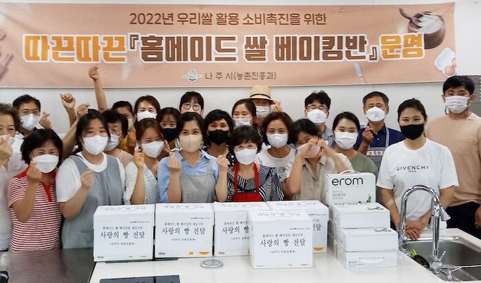 나주시(시장 윤병태)는 농업기술센터에서 운영한 ‘홈메이드 쌀 베이킹’ 반 교육생들이 우리 쌀로 직접 만든 빵을 관내 노인전문요양원에 전달했다고 25일 밝혔다.