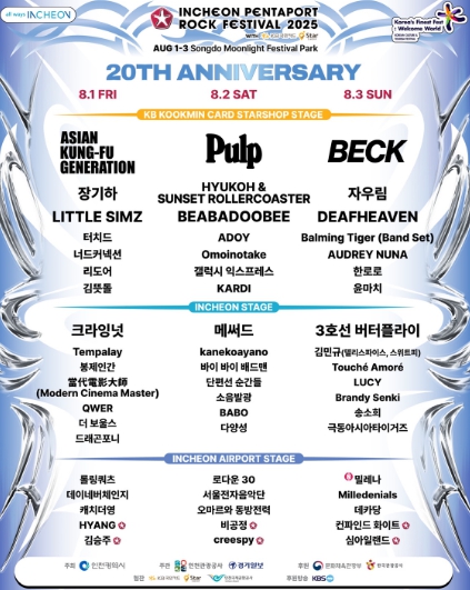 20주년을 맞이한 ‘2025년 인천펜타포트 락 페스티벌’은 전 세계 음악 팬들이 주목할 초호화 라인업으로 기대를 모은다. 영국 브릿팝의 전설 펄프(Pulp), 얼터너티브 록의 아이콘 백(BECK), 일본 록을 대표하는 아시안 커프 제너레이션(ASIAN KUNG-FU GENERATION)을 비롯해, 펜타포트의 20년 역사와 함께해온 자우림, 크라잉넛, 3호선 버터플라이, 델리스파이스의 김민규, 장기하, 갤럭시 익스프레스 등과 더불어 비바두비(BEABADOOBEE), 리틀 심즈(Little Simz), Z세대를 대표하는 오드리 누나(Audrey Nuna), 감성 시티팝의 주역 오모이노타케(Omoinotake), 혁오 × 선셋 롤러코스터(HYUKOH × Sunset Rollercoaster), QWER, 바보 등 국내외 총 58팀이 무대에 오른다.