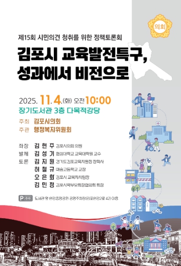 [세계로컬타임즈] 김포시의회는 김포시 교육발전특구의 추진 성과를 점검하고 향후 비전과 정책 방향을 모색하기 위해 오는 11월 4일 장기도서관 3층 다목적강당에서 정책토론회를 개최한다.