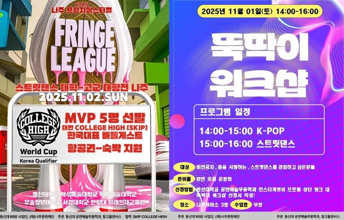워크숍은 ‘케이팝 원데이 클래스’와 ‘스트릿 댄스 원데이 클래스’로 운영되며 참가비는 무료로 사전 예약 또는 현장 접수 모두 가능하며 선착순으로 마감된다.