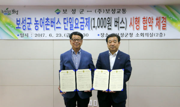 [세계로컬신문 김수진 기자] 전남 보성군이 오는 7월 1일부터 천원버스 본격 시행을 앞두고 ㈜보성교통과 23일 군 소회의실에서 운송협약을 체결했다.