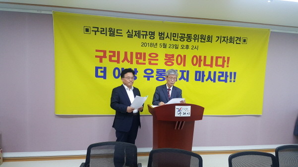 | ▲ 23일 구리시청 브리핑 룸에서 구리월드 실체규명 범시민공동위원회 공동위원장(박수천·김상철)이 기자회견을 하고 있다. <사진=고성철 기자> |