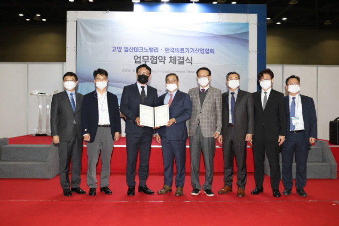 | ▲28일 킨텍스 어워즈관에서 한국의료기기산업협회(회장 이경국)와 고양 일산테크노밸리 성공적 추진을 위한 업무협약을 체결했다. (사진=고양시 제공) |