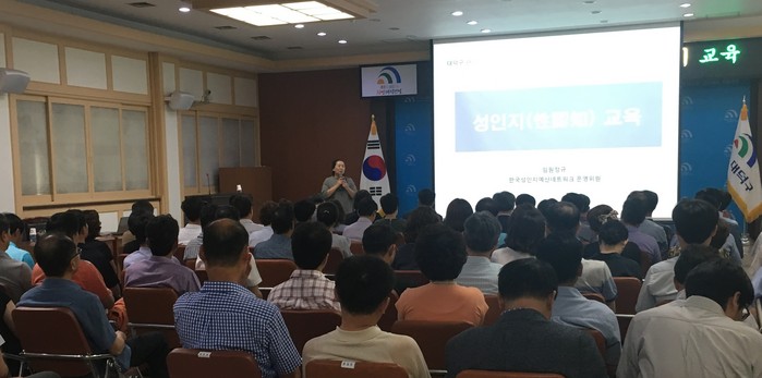 | ▲대전 대덕구 6급 이상 관리직 공무원들이 26일 구청 중회의실에서 성인지교육을 받고 있다. <사진제공=대전 대덕구청> |