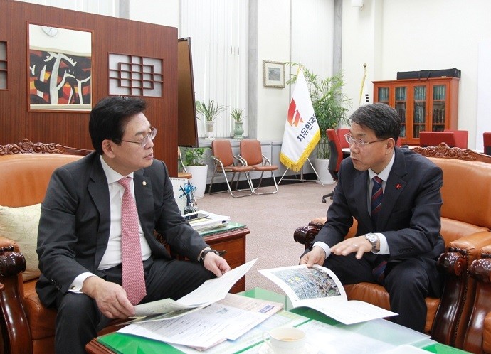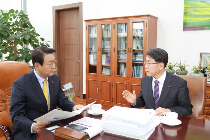 | ▲이재관 대전시장 권한대행이 국회에서 정우택 자유한국당 원내대표 만나 대전현안사업을 설명하고 있다. |