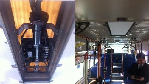 | ▲ 서울시가 시내버스에 설치 예정인 공기정화필터(왼쪽) 모습과 실제 버스 내부에 장착된 모습. <사진제공=서울시> |