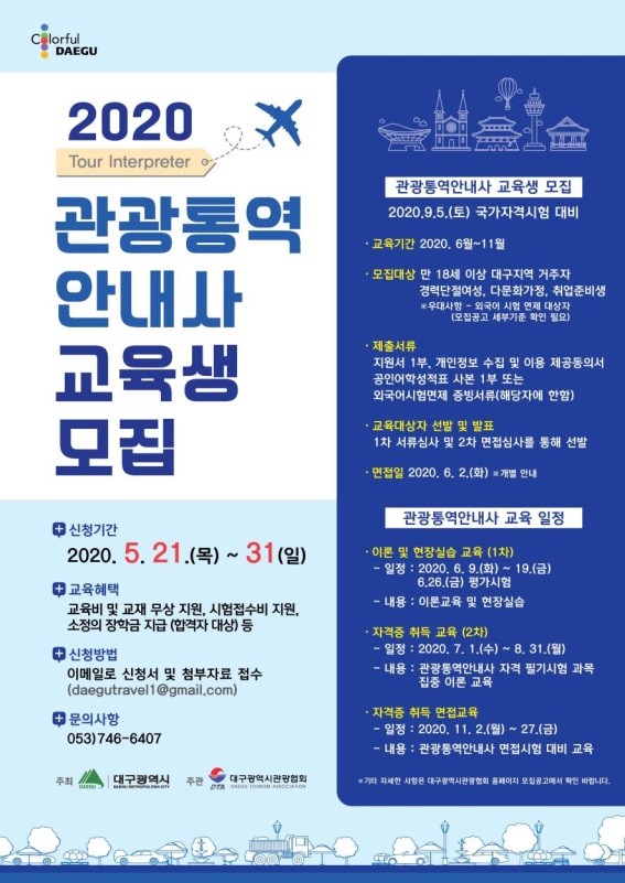 이에 대구시는 이달 21~31일 ‘2020년 관광통역안내사 자격증 취득 교육생’을 모집한다.