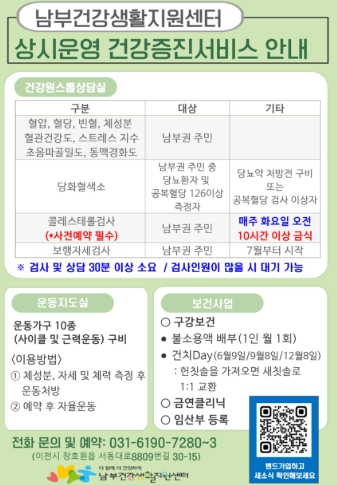 위와 관련한 새로운 센터 소식은 ‘남부건강생활지원센터 밴드’를 통하여 가장 빠르게 확인할 수 있고 검사예약과 문의는 전화로 하면 된다.