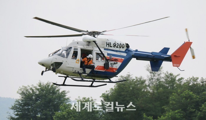 [세계로컬신문 오영균 기자] 20m 상공의 헬기에서 호이스트를 이용해 낙하한 소방대원이 팔이 골절된 시민을 응급처치한 뒤 안전벨트로 자신의 몸에 밀착시키고 재차 호이스트를 활용 헬기에 올라탄다.