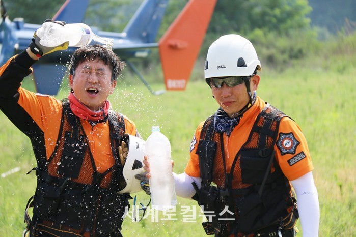 | ▲구조대원들이 항공구조 도상훈련 및 항공구조장비 조작 등 특별훈련을 마치고 시원한 얼음물로 더위를 식히고 있다.<오영균 기자> |