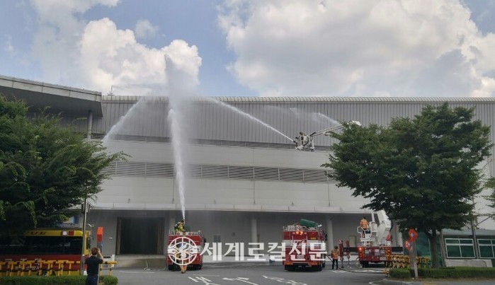 [세계로컬신문 오영균 기자] 대전소방본부가 11일 대전컨벤션센터 회의장에서 2017아·태도시 정상회의 기간 중 재난사고에 대비 하기 위해 북부소방서와 자위소방대원 등 50여명이 참여한 가운데 합동 소방훈련을 열고 있다. 아·태도시정상회의는 다음달 10일부터 13일까지 대전컨벤션센터 일원에서 4일간 열리며 세계 100여개 주요도시 정상 등 1500여명이 참가하는 대규모 국제행사다.