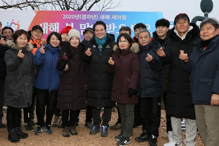 | ▲ 2020년 새해 새아침에 와룡산 전망대에서 최대호(가운데) 안양시장과 함께 기념촬영을 하고 있다. (사진=안양시 제공) |