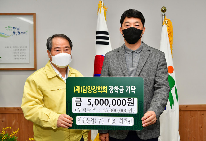 [세계로컬타임즈 이남규 기자] 지난 25일 인원산업 최철원 대표가 담양장학회에 500만 원의 장학금을 기탁했다.