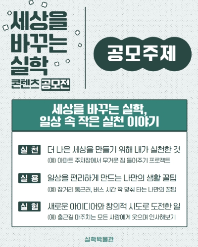 한편 실학박물관은 지난해부터 대중이 실학이라는 학문을 새롭게 인식하고 일상 속 문화로 자리매김할 수 있도록 다양한 시도를 펼치고 있다. 이번 공모전 역시 실학박물관이 추진 중인 작은 실험 지원사업 〈실·실·실 프로젝트〉의 연장선에서 진행된다.