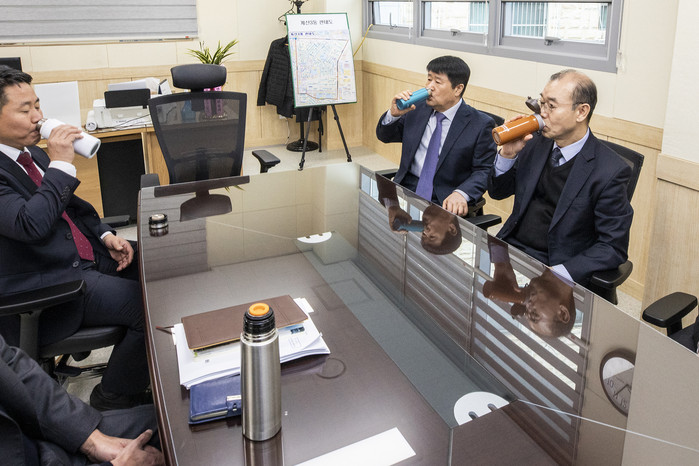[세계로컬타임즈 장선영 기자] 박형우 인천 계양구청장은 계산3동 행정복지센터 준공식장에서 직원들과 티타임을 가지며 ‘플라스틱 프리 챌린지’ 캠페인에 참여했다.