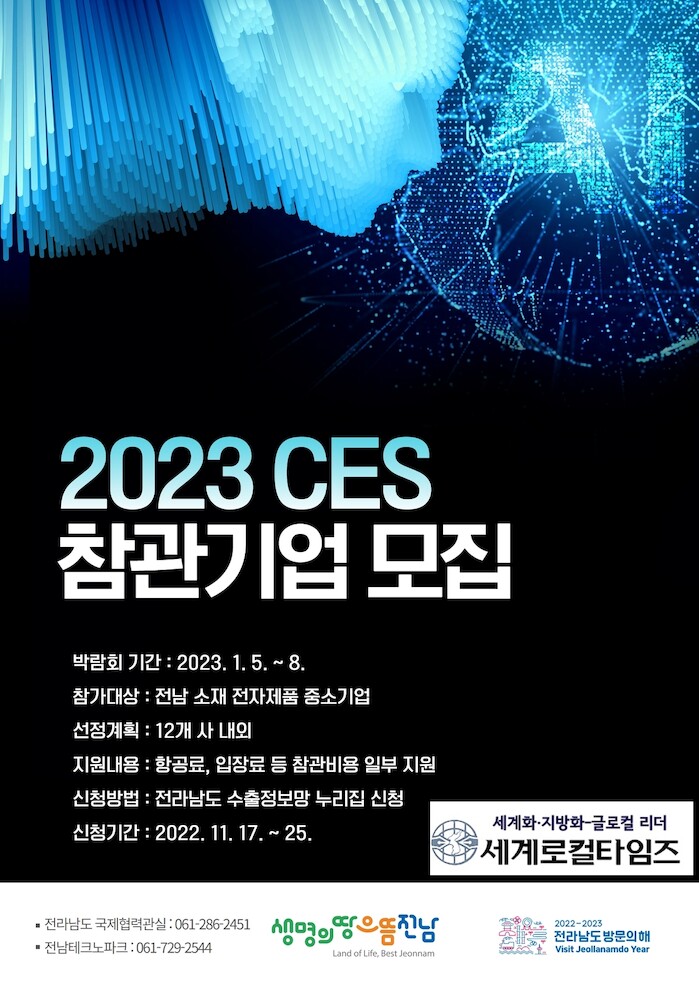 [세계로컬타임즈 김명진 기자] 전라남도가 2023년 1월 미국 라스베이거스에서 열리는 세계 최대 소비자 전자제품 박람회인 ‘2023 세계가전전시회(CES)’ 참관 기업을 모집한다고 밝혔다.