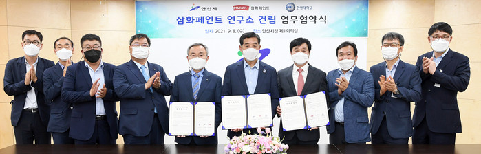 [세계로컬타임즈 김상우 기자] 안산시는 8일 시청에서 윤화섭 안산시장과 류기붕 삼화페인트 대표이사, 김우승 한양대 총장 등이 참석한 가운데 삼화페인트 연구소 건립을 위한 업무협약을 체결했다.