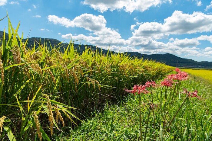 | ▲ 논둑에 상사화가 피어있는 벼 유기농 단지(사진=영광군) |