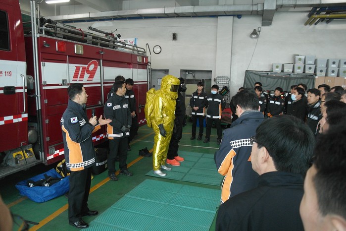 | ▲ 대전북부소방서 대원들이 방사선 누출사고 대비 소방초동 대응절차 교육받는 모습. |