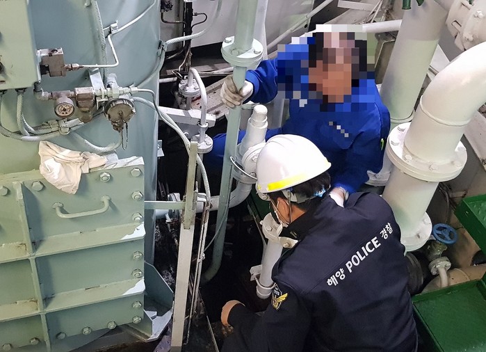 | ▲목포해경이 화물선의 기름오염방지설비 작동상태를 점검하고 있다(사진=목포해경) |