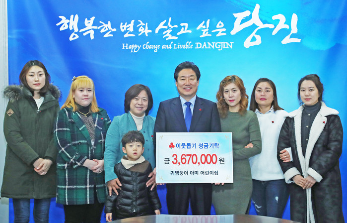 | ▲ 충남 당진시 '귀염둥이 아띠 어린이집'에 다니는 원생과 학부모들이 이웃돕기 성금 기탁을 하고 기념촬영을 하고 있다. |