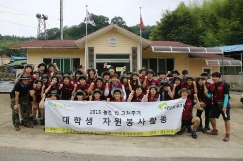 | ▲ 경상대 대학생 자원봉사자들이 농어촌 어르신 집 고쳐주기 활동을 펼치면서 단체로 기념촬영하고 있다.<사진제공=산청군청> |